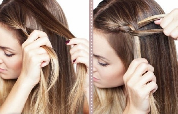 - B2: Bạn có thể bắt đầu từ bên trái hoặc phải tùy thích, tết ba thông thường, đến nút thứ hai bắt đầu thả lọn tóc xuống và lấy tiếp lọn khác sao cho tạo thành một đường cố định ôm sát đầu như hình hướng dẫn.